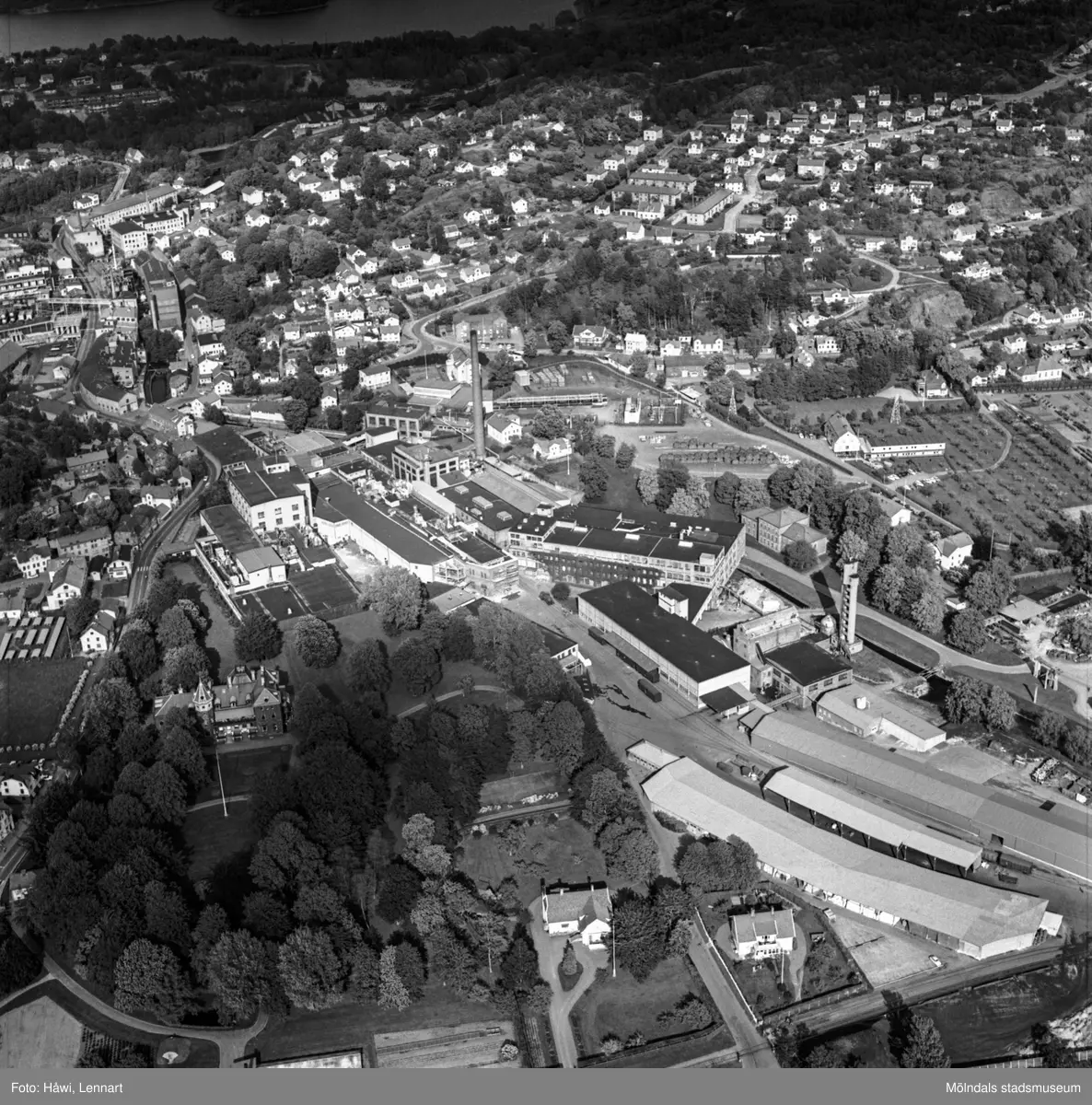 Titel: Flygfoto över pappersbruket Papyrus fabriksområde i Mölndal, 9/6 1969. Till höger om fabriksbyggnaderna syns Yngeredsfors fruktodlingar.