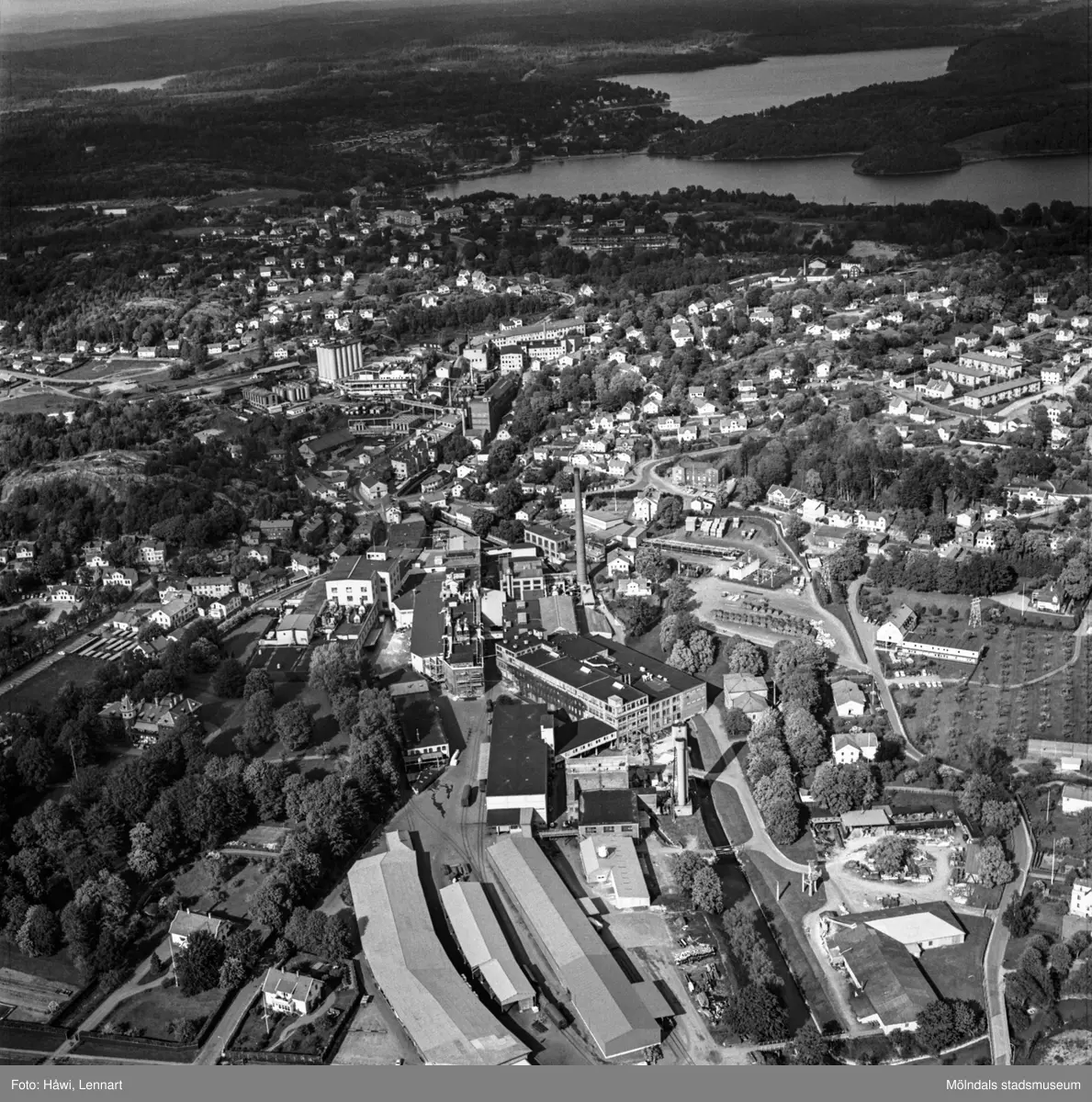 Flygfoto över pappersbruket Papyrus fabriksområde i Mölndal, 9/6 1969. I bildens kant, till höger om fabriksbyggnaderna, syns Yngeredsfors fruktodlingar.
