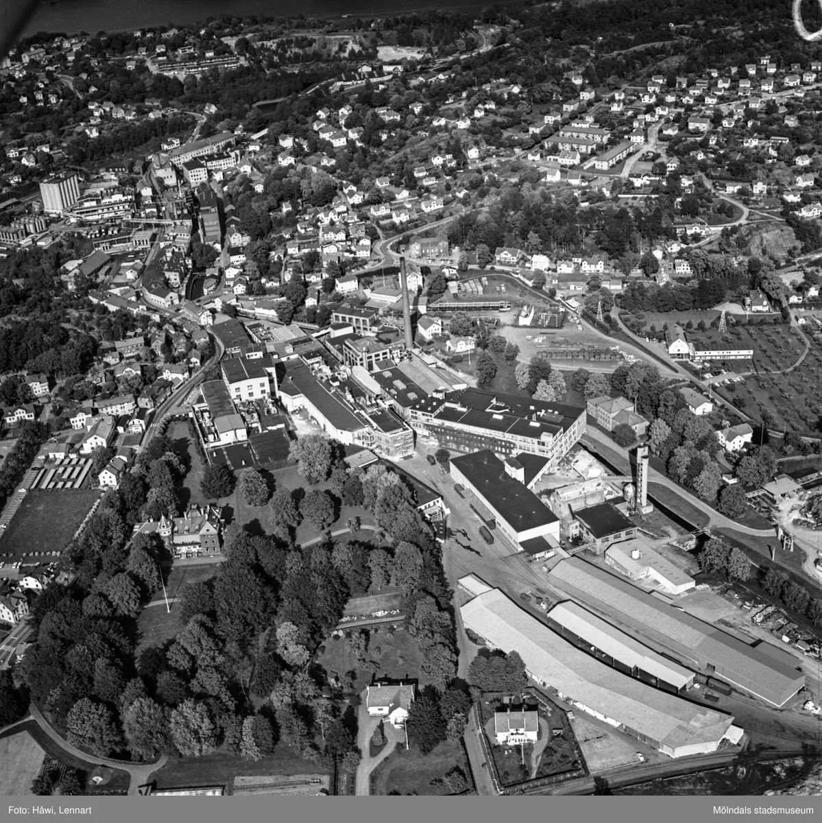 Flygfoto över pappersbruket Papyrus fabriksområde i Mölndal, 9/6 1969. Till höger om fabriksbyggnaderna syns en del av Yngeredsfors fruktodlingar.
