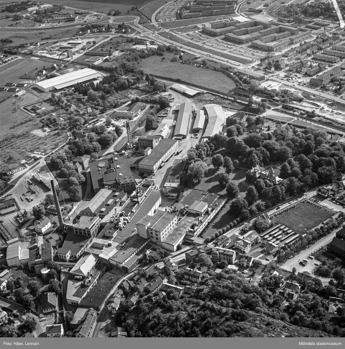 Flygfoto över pappersbruket Papyrus fabriksområde i Mölndal, 9/6 1969. Till vänster om fabriksbyggnaderna syns en del av Yngeredsfors fruktodlingar.