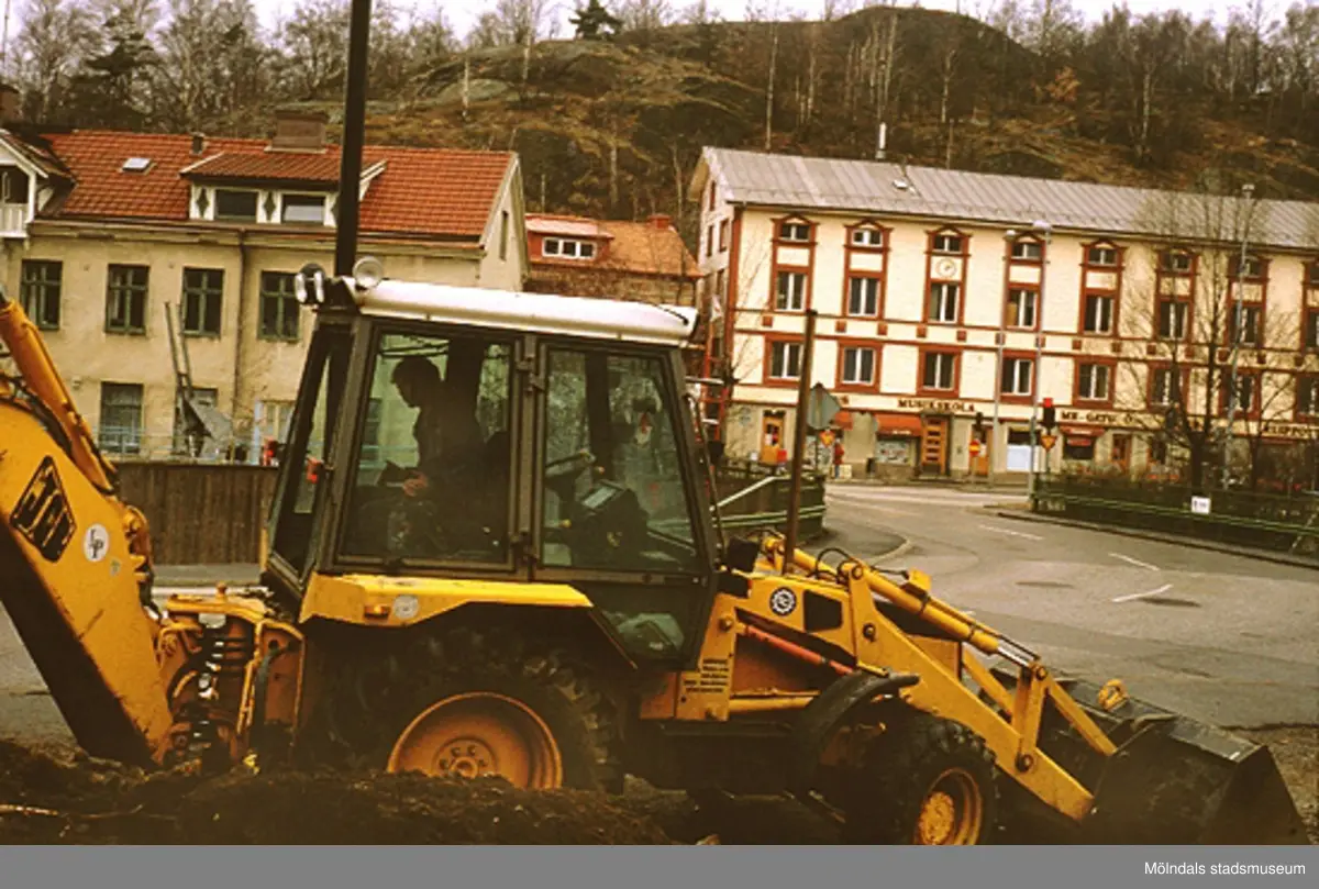 Grävarbete vid Lyktplatsen, april 1993. Rakt fram ses Forsebron. I bakgrunden till vänster ses Byggnad 213 på Kvarnbygatan 4 och till höger Gamla stadshuset på Gamla torget.