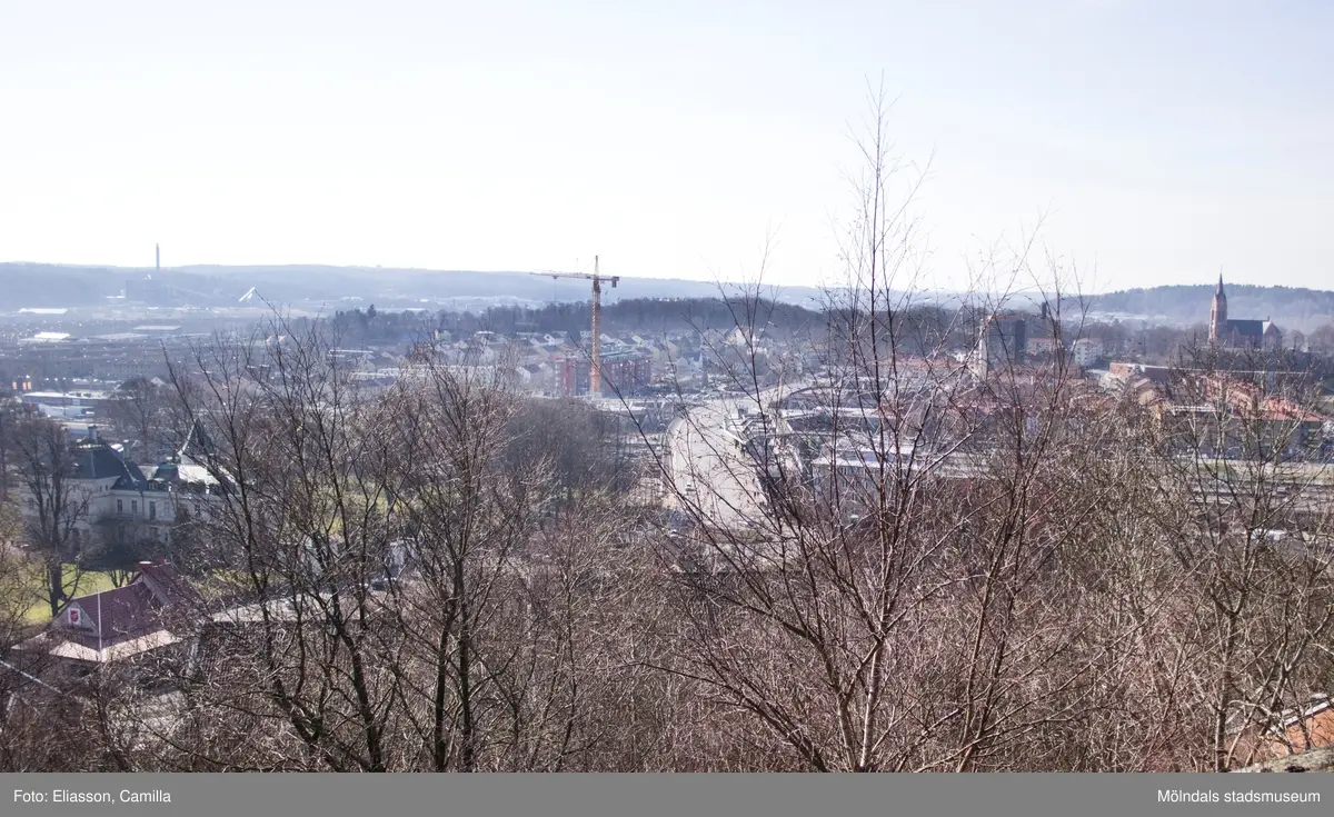 Vy från Störtfjället över området Trädgården, stora delar av Mölndal och Fässberg. Till vänster, den slottsliknande villan med torn i Forsåkers-området, var tidigare en disponentvilla tillhörande Papyrus. Man ser tydligt Mölndalsbron som går över E6/E20. Byggkranen i mitten, bredvid bron, har påbörjat bygget av SCAs runda kontorsbyggnad. Fässbergs kyrka tronar till höger i bild.