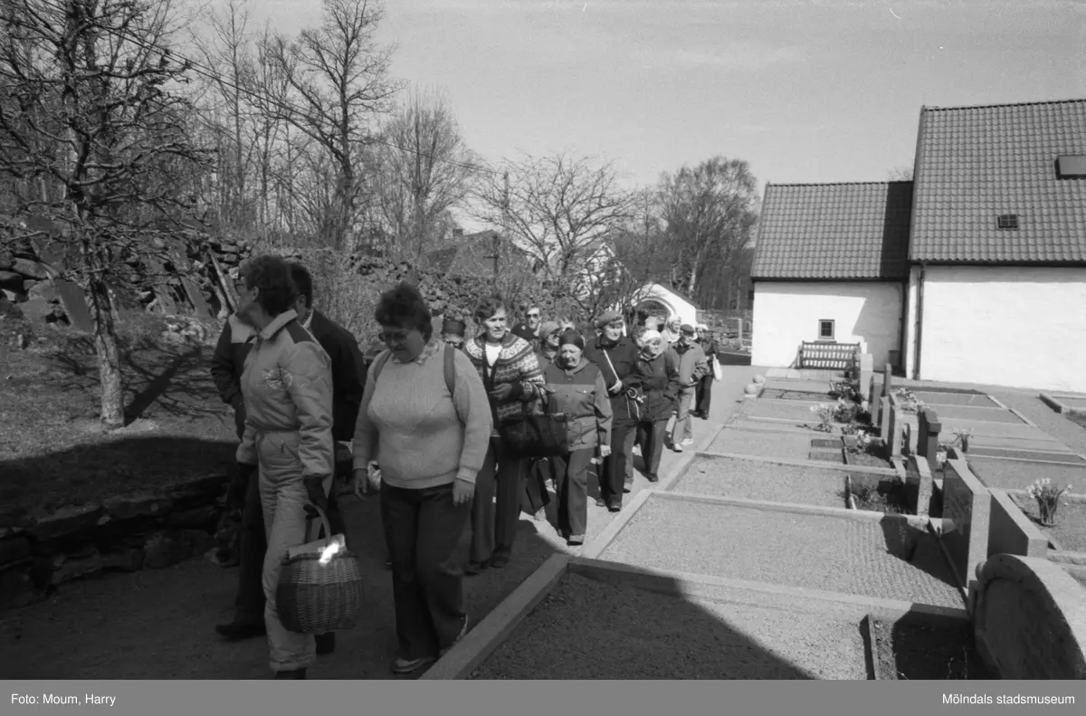 Kållereds hembygdsgille anordnar sockenvandring i området vid Kållereds kyrka, år 1984. "Hembygdsgillet i Kållered på sockenvandring vid kyrkan på kullen."