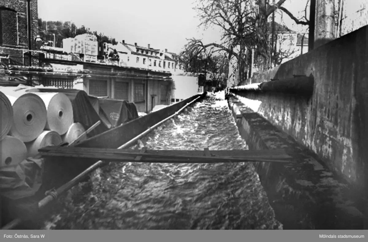 Exteriör utanför Papyrus, med forsen och pappersbalar i förgrunden, 1980-tal.