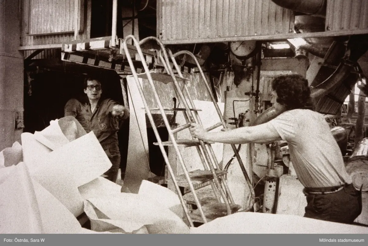 Anders Severed och Bo Ternmalm åtgärdar ett banbrott i Byggnad 6 (antagligen KM 2) på Papyrus i Mölndal, år 1990.