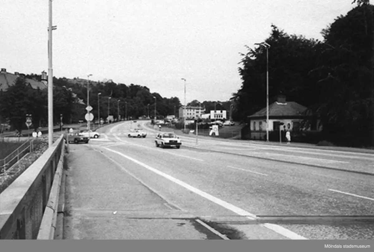 Vy från nya Mölndals Bro (vägbron) utefter vägbanan, i riktning mot Kvarnbygatan och Gamla Mölndal i öster, 1970/80-tal. Till vänster bakom träden skymtar Kvarnbyskolan. Till höger ses Villa Papyrus garagebyggnad.