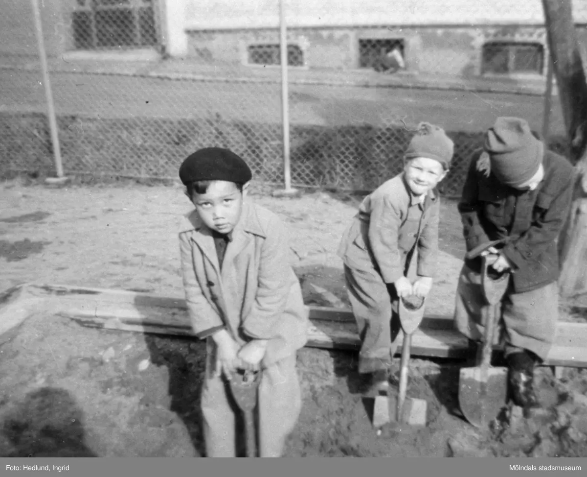 Förskola i Guldheden, Göteborg, 1945-. Pojkar som leker i sandlådan.