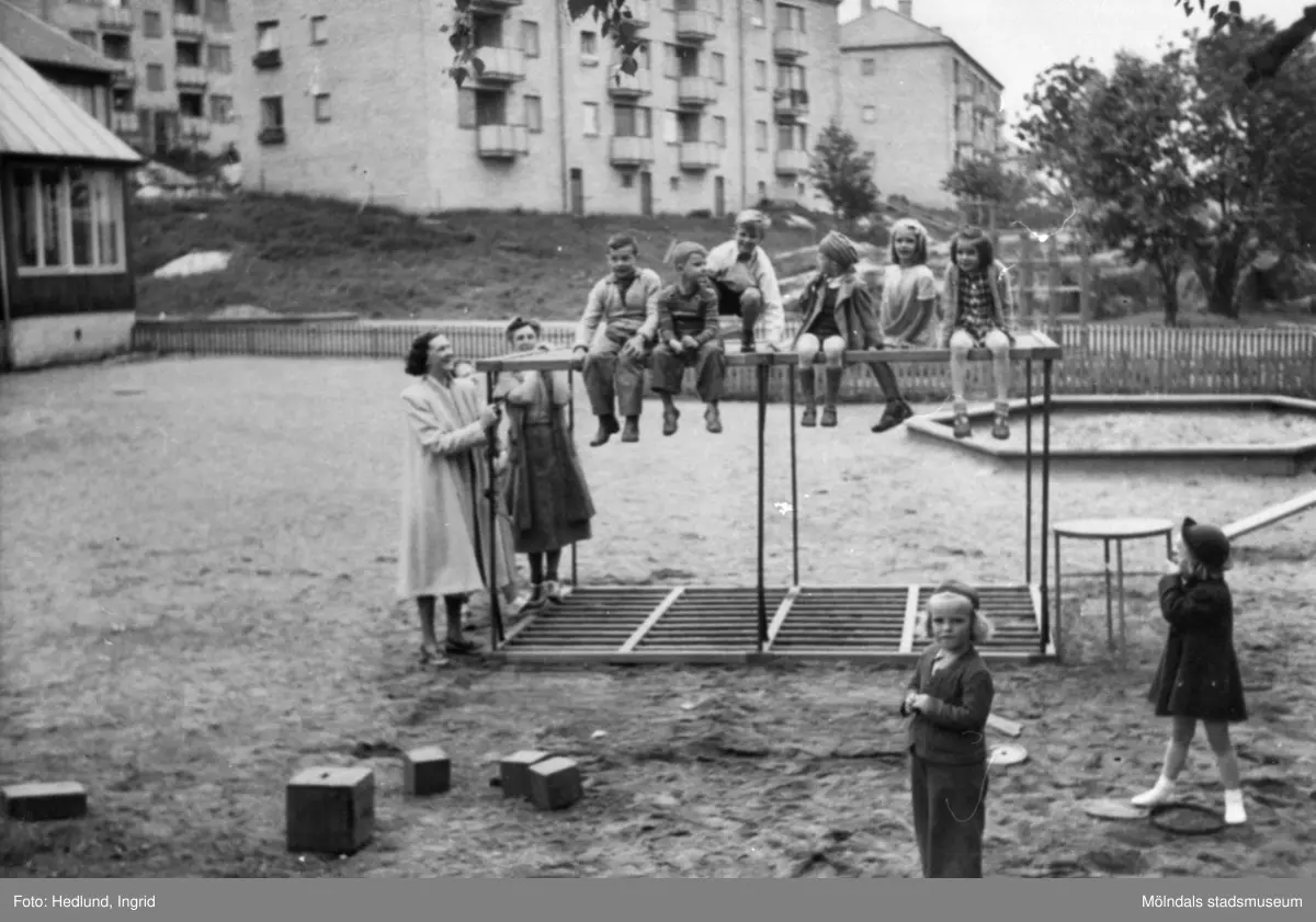 Lekande barn på en lekplats utanför ett daghem. Guldheden i Göteborg 1945-.