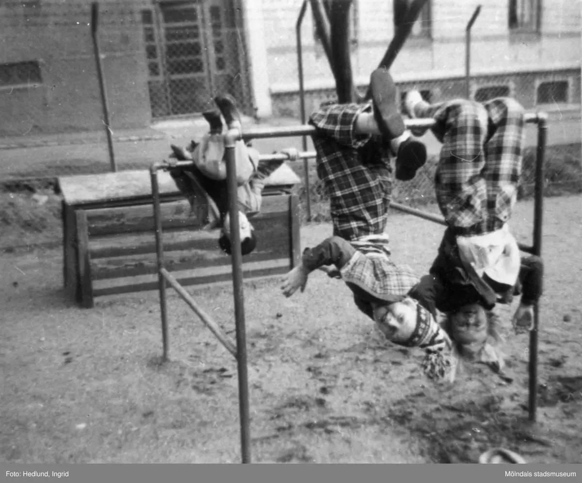 Tre barn som hänger i en klätterställning. 1940-tal, plats okänd.