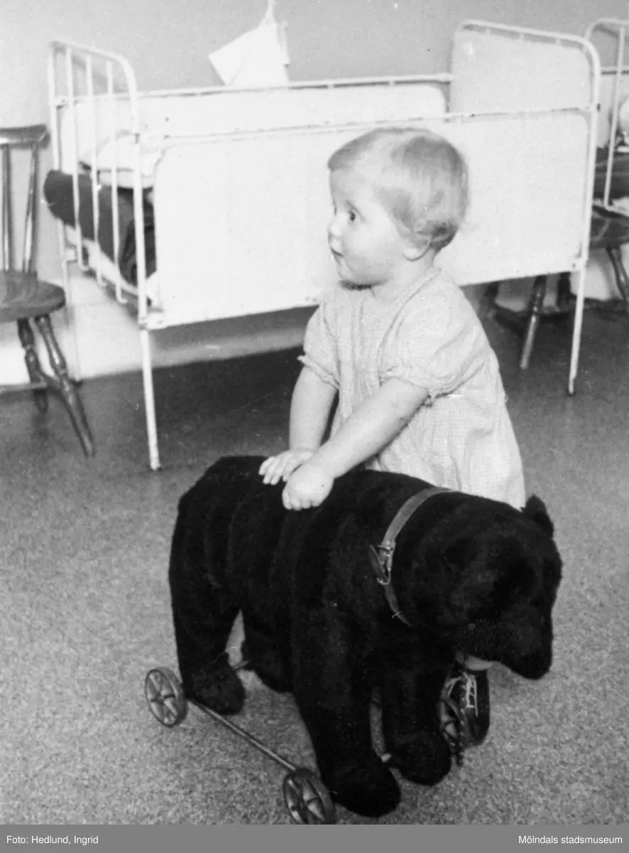 Mölndal 1935. Sonja Berna som står vid en leksaksbjörn.