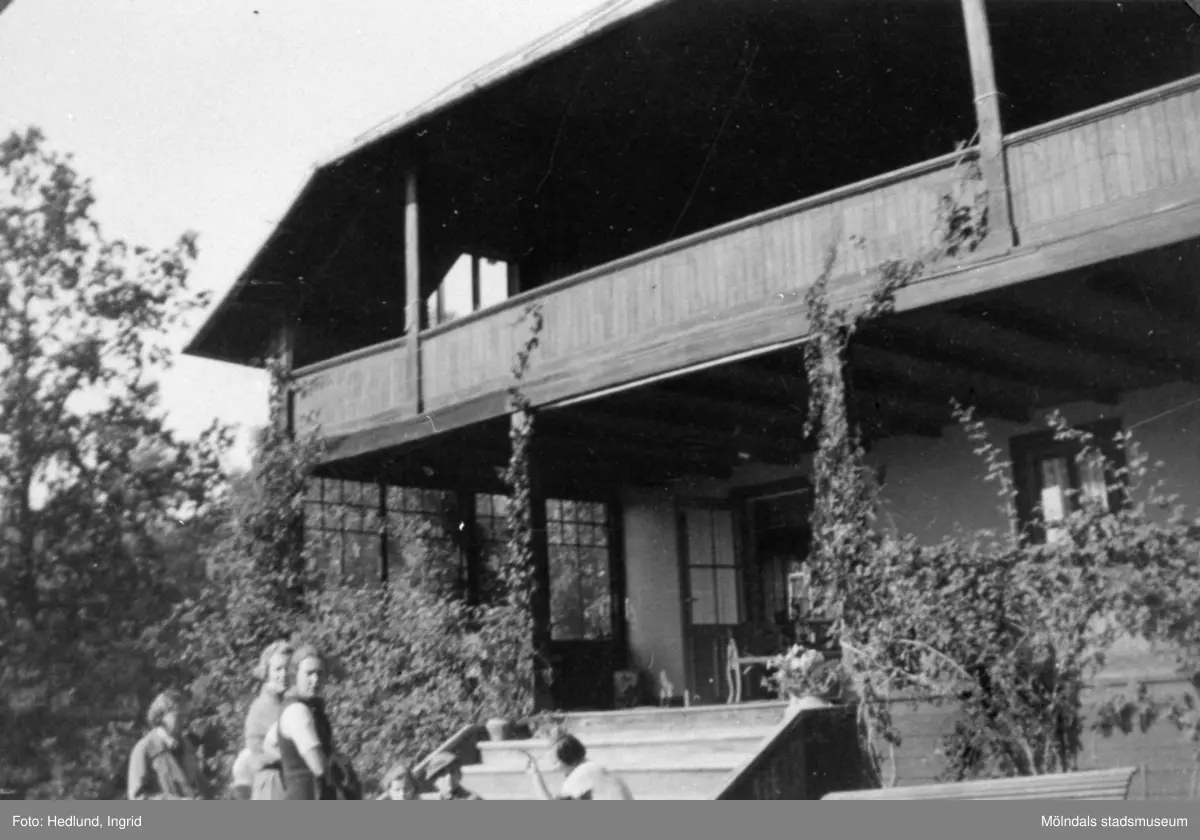 Några kvinnor står utanför en byggnad. Getå Grönkärr. Årtal okänt.