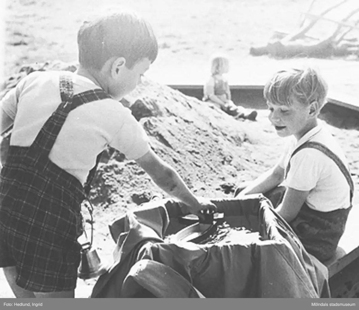 Två pojkar gör en vattenlek i sandlådan. Daghem i Guldheden, Göteborg. Sent 1940-tal.