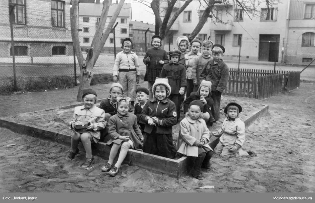 Några barn som står i en sandlåda uppställda för fotografering. Okänd plats 1945-.