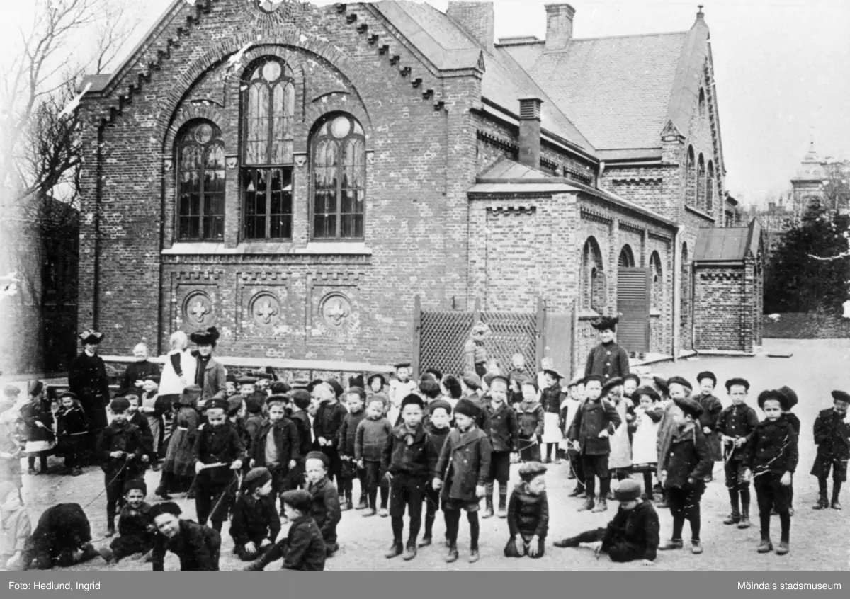 Förskola Folke Bernadottes gata 4, Göteborg. Årtal okänt. Barnen står utanför förskolan.