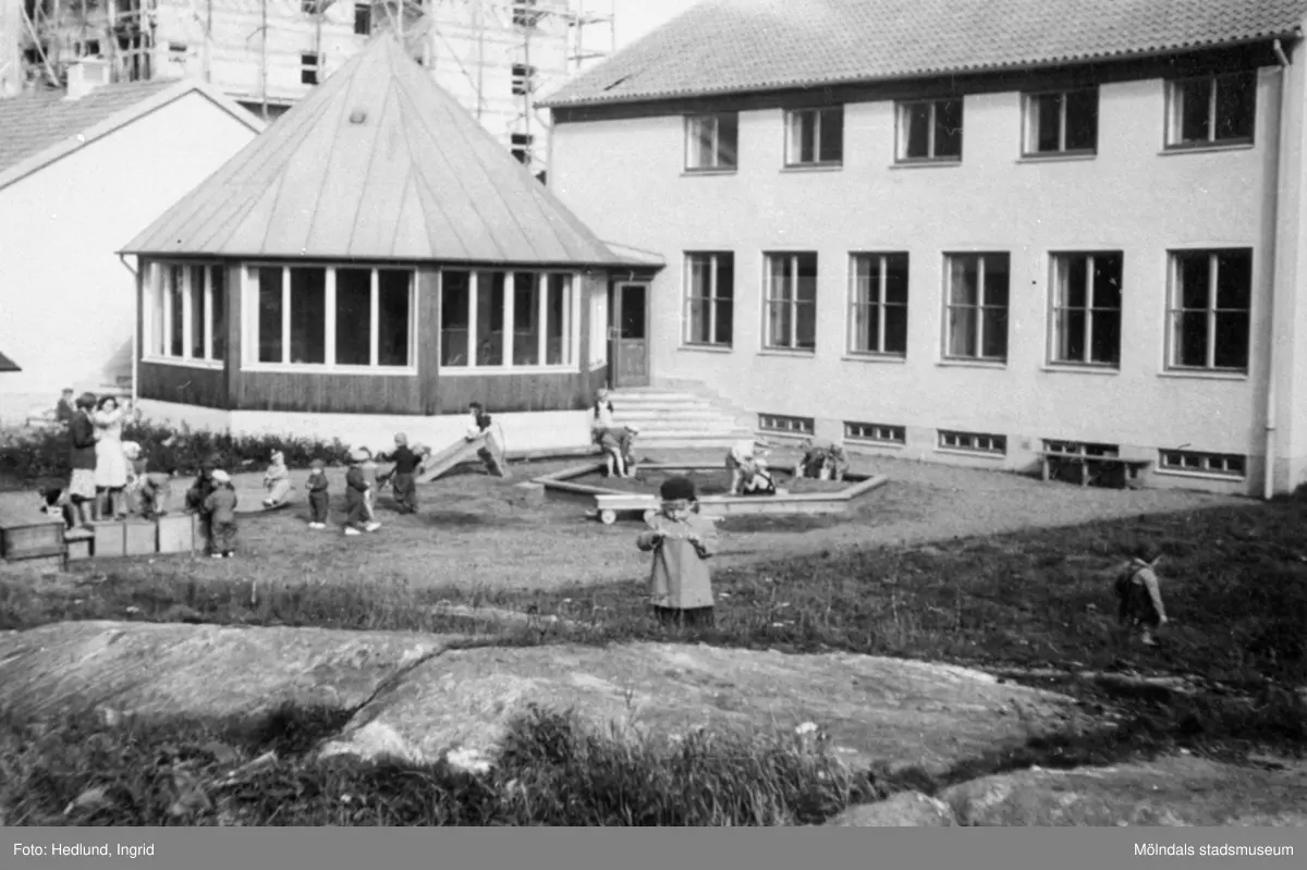 Lärare och barn utomhus vid ett daghem i Guldheden, Göteborg, 1940-tal.