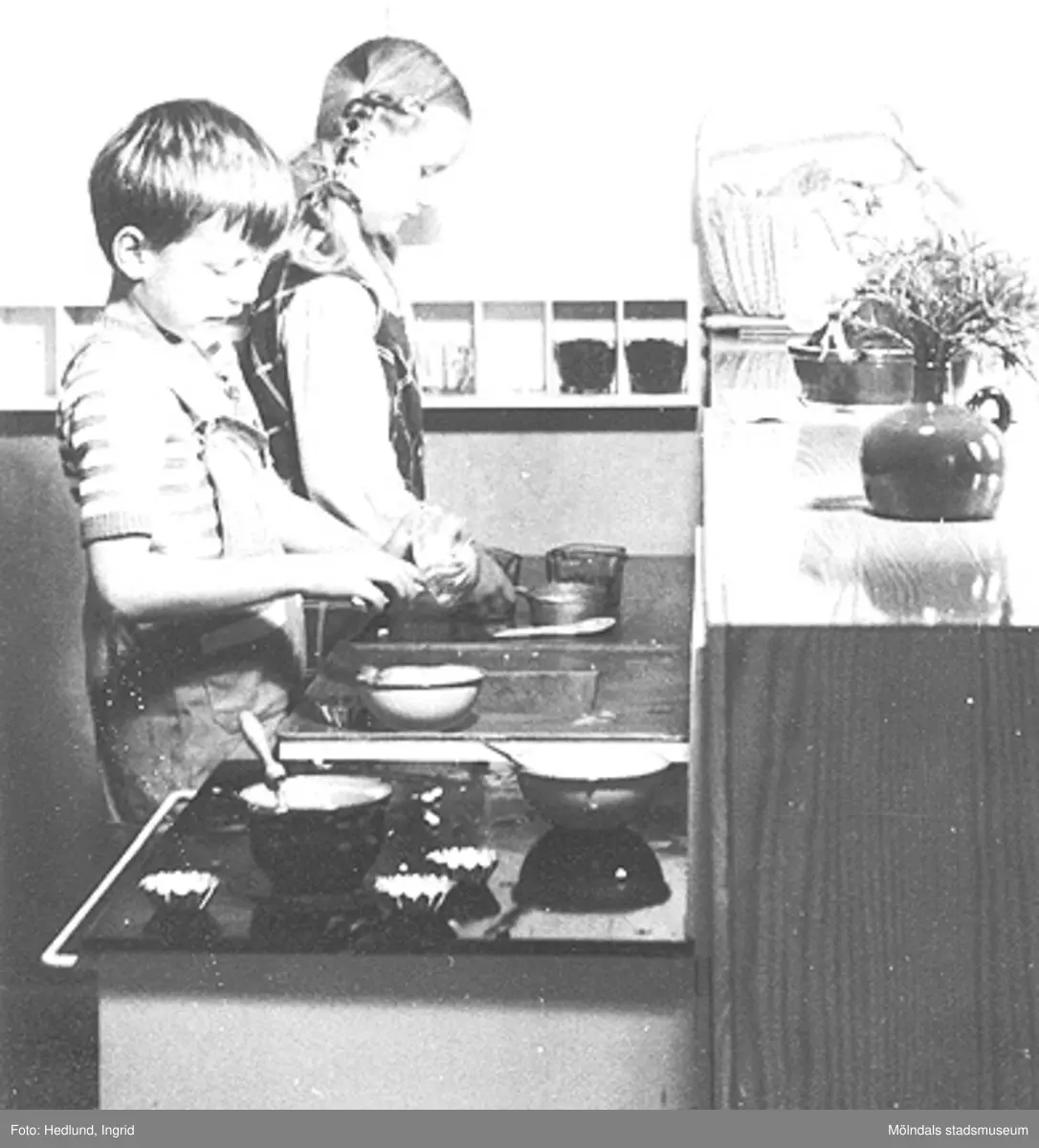 En pojke och en flicka leker att de lagar mat i ett barnkök. Daghem i Guldheden, Göteborg. Sent 1940-tal.