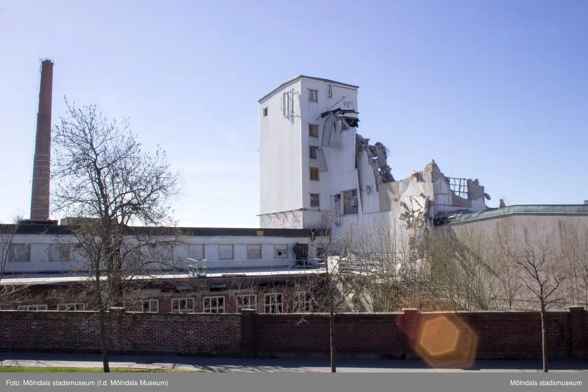 Byggnadsdokumentation av Papyrusskorstenens rivning 2015-05-08. Byggnad 6 (kartongfabriken) ses till höger.