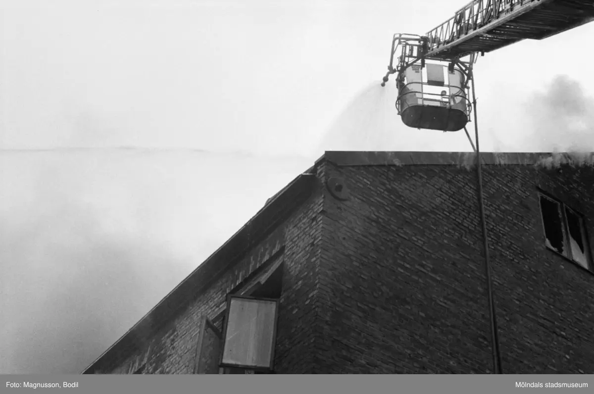 Soab-branden i Stora Götafors den 4 juni 1986. Branden bekämpas över taket från en lyftanordning.