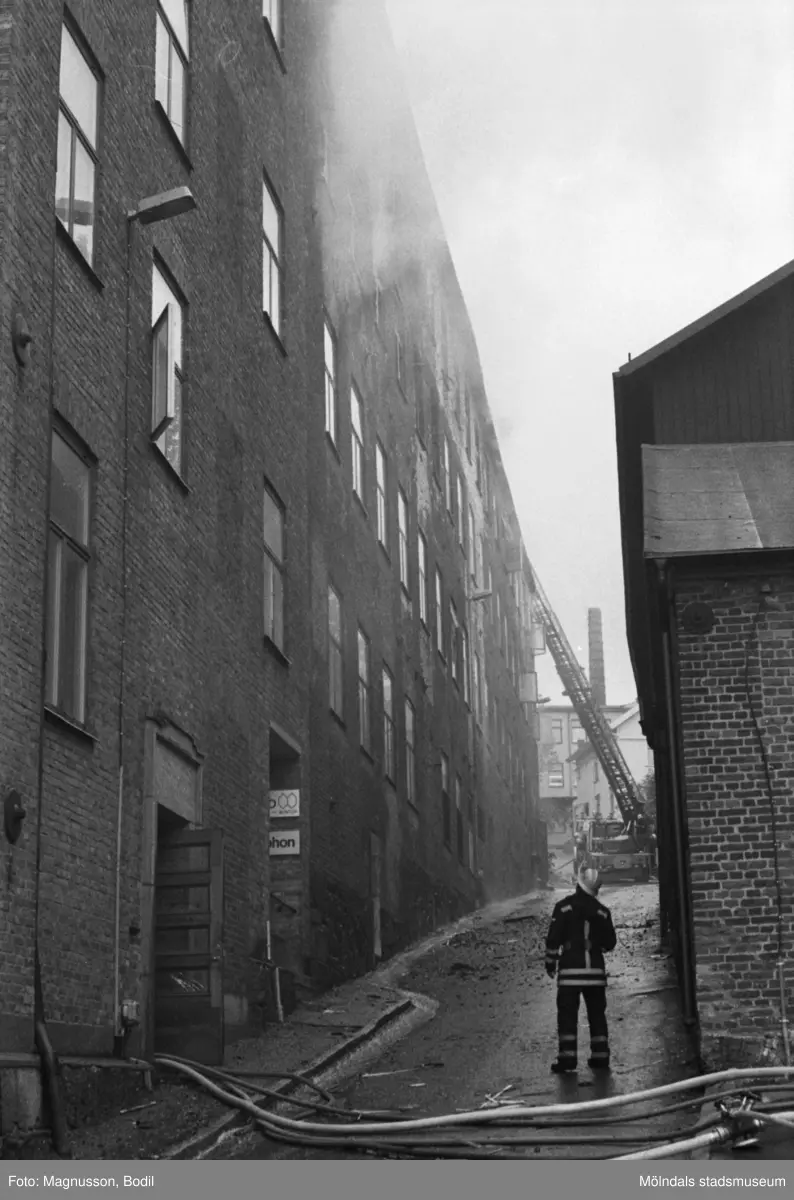 Soab-branden i Stora Götafors den 4 juni 1986. En brandman står på Götaforsliden och tittar upp mot fastigheten.