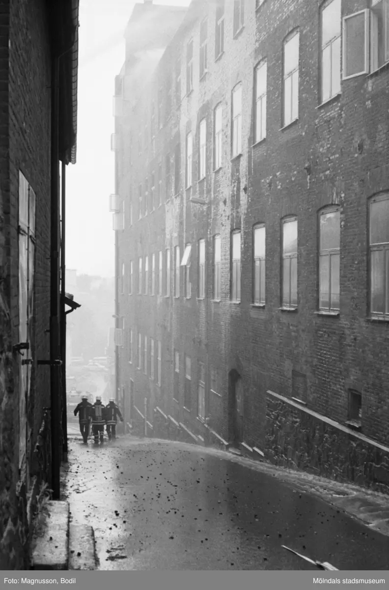 Soab-branden i Stora Götafors den 4 juni 1986. Tre brandmän går nedför Götaforsliden.