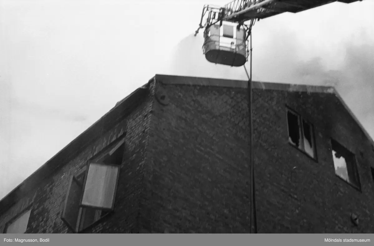 Soab-branden i Stora Götafors den 4 juni 1986. Branden bekämpas över taket från en lyftkran.