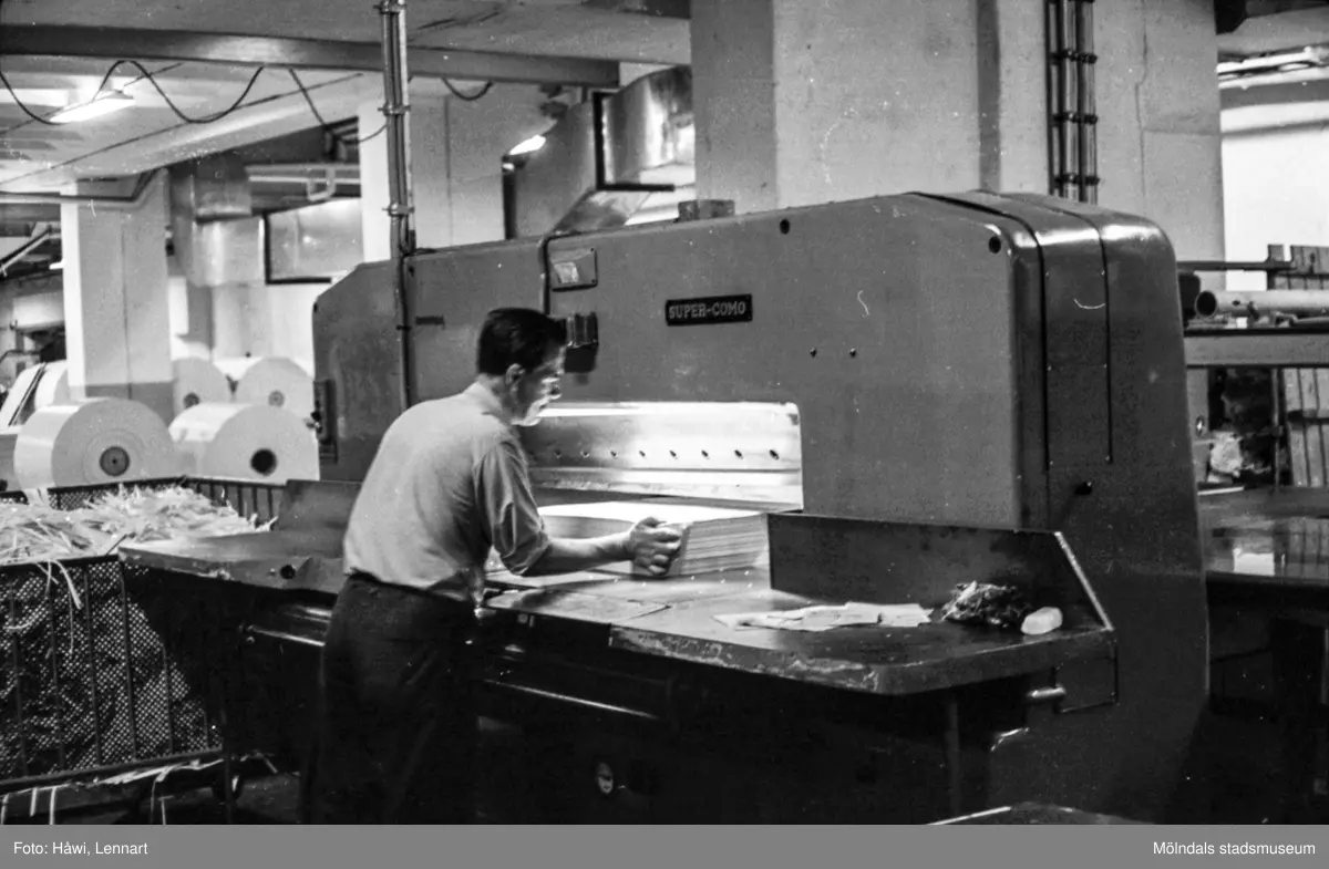 Man i arbete vid skärmaskin på pappersbruket Papyrus i Mölndal, hösten 1970. Skärmaskinen kallades för giljotin av de anställda. Mannen arbetar som skärare. Skärsalen, tredje våningen? Byggnad 18.