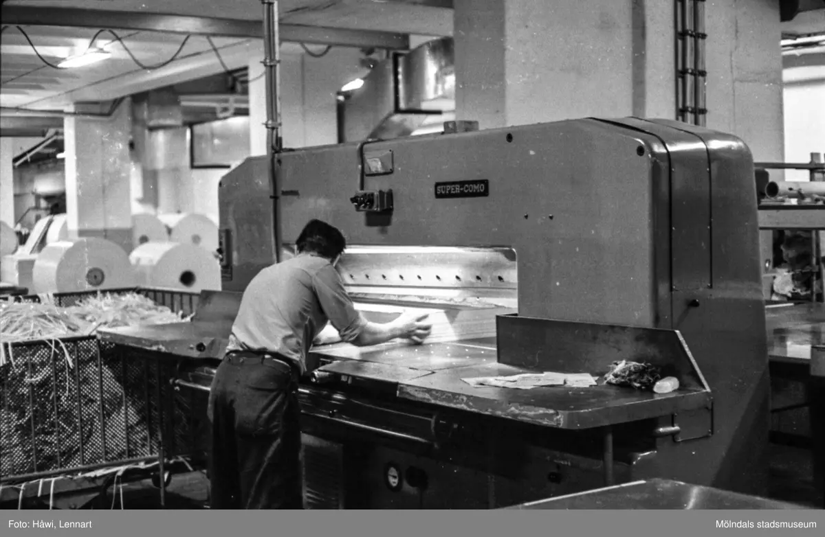 Man i arbete vid skärmaskin på pappersbruket Papyrus i Mölndal, hösten 1970. Skärsalen, tredje våningen? Byggnad 18.