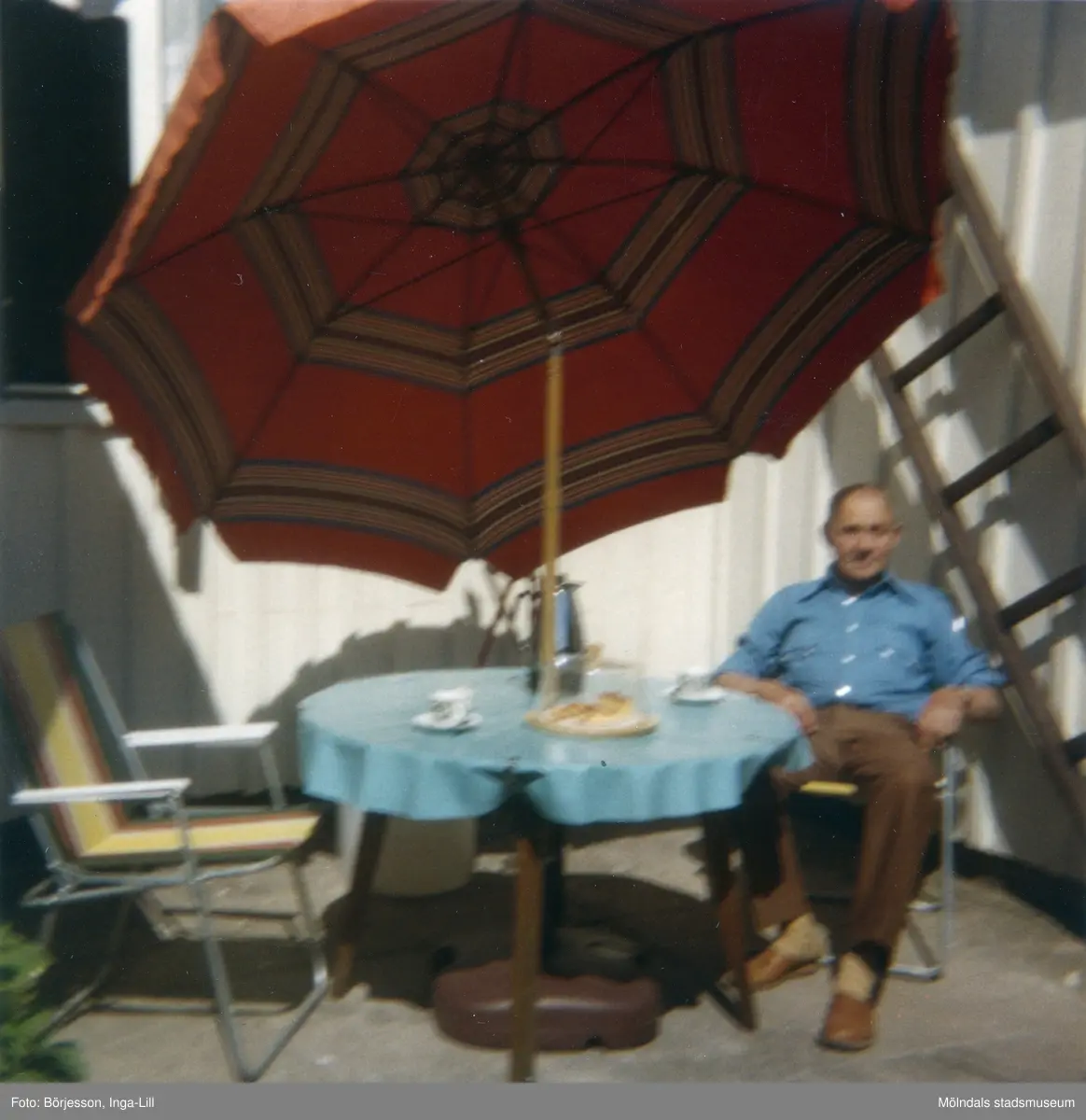 Solhemsgatan 10, år 1978. Åke Börjesson på den soliga uteplatsen mellan ingången till hushalvan. En omtyckt uteplats.