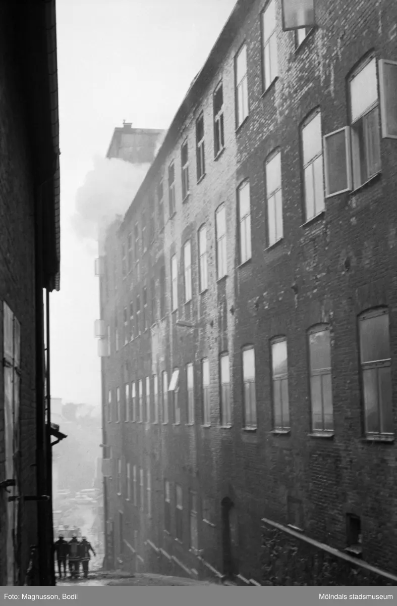 Soab-branden i Stora Götafors den 4 juni 1986. Tre brandmän går nedför Götaforsliden.
