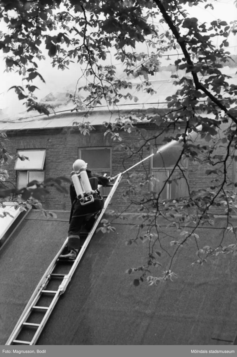 Soab-branden i Stora Götafors den 4 juni 1986. En brandman som sprutar vatten.