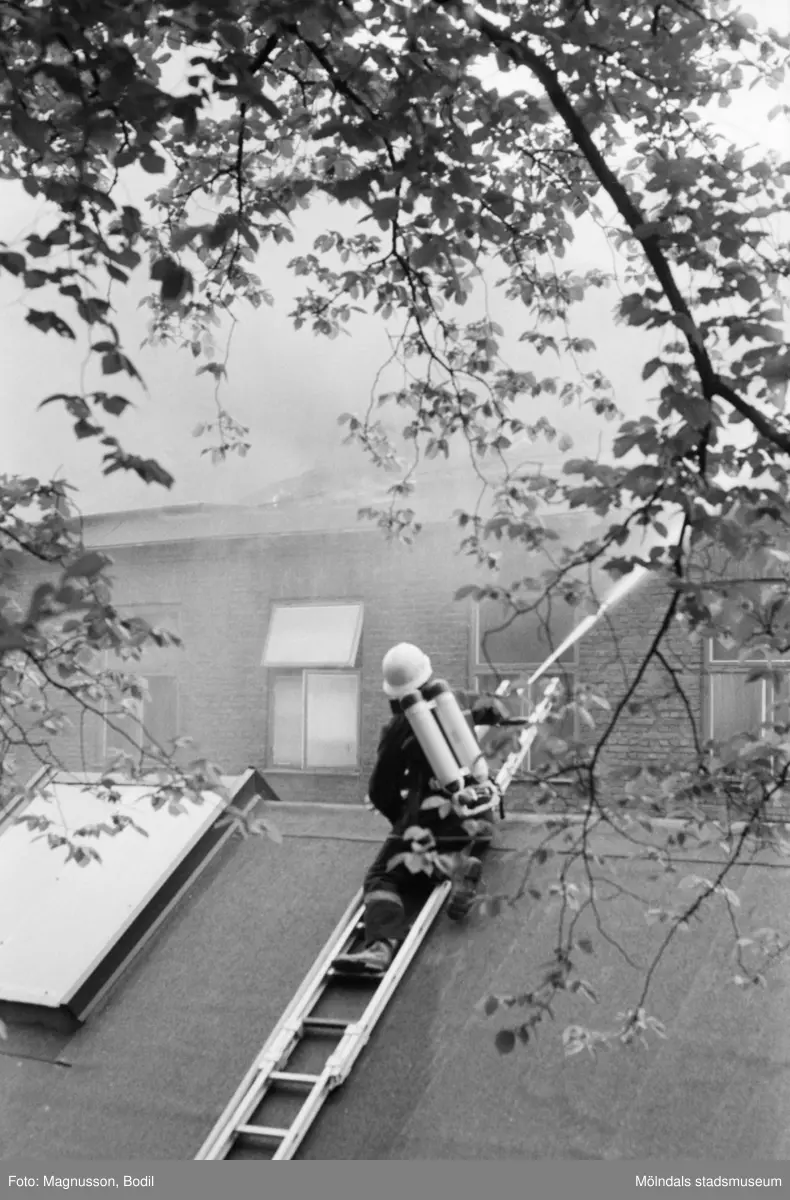Soab-branden i Stora Götafors den 4 juni 1986. En brandman sprutar vatten från taket på andra sidan gatan.