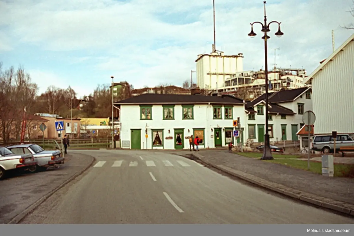 Kafé Kråkan (Götaforsliden 1-7, Kvarnfallet 26) vid forsen och Forsebron cirka 1987. I bakgrunden ses Soabs silotorn. Till höger ligger Lyktplatsen.