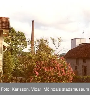 Utsikt från bostadshuset Roten F25s trädgård mot Papyrus och Roten G6 (Trädgårdsgatan 2B). Lila syrénbuskar i förgrunden.