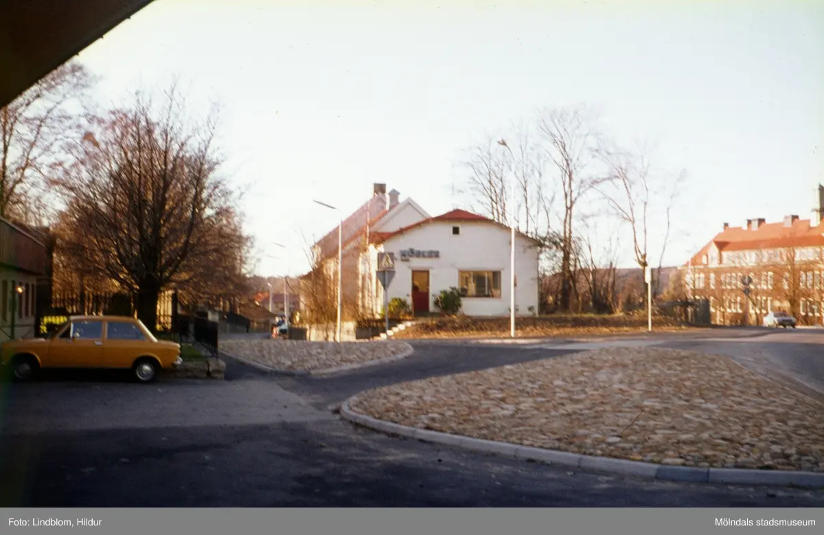 Vy från Papyrus port mot hus på Kvarnbygatan i Mölndal, 1970-tal. I mitten av bilden ses frälsningsarméns hus med adress Kvarnbygatan 19 samt nr 21 som är en möbelaffär. Till höger ses Kvarnbyskolan.