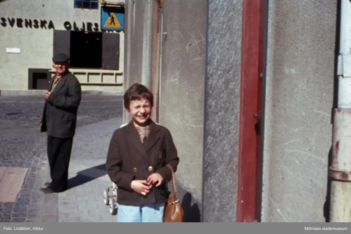 Lisbeth Sjöberg, dotter till Märta Sjöberg, fotograferad på trottoaren utanför Rasmussons skoaffär med adress Kvarnbygatan 4 vid Gamla Torget i Mölndal, ca 1961-1962. Längre bort på gatan står en man vid ett övergångsställe. I bakgrunden ses del av gaveln till huset Kvarnbygatan 6, byggnad tillhörande SOAB.