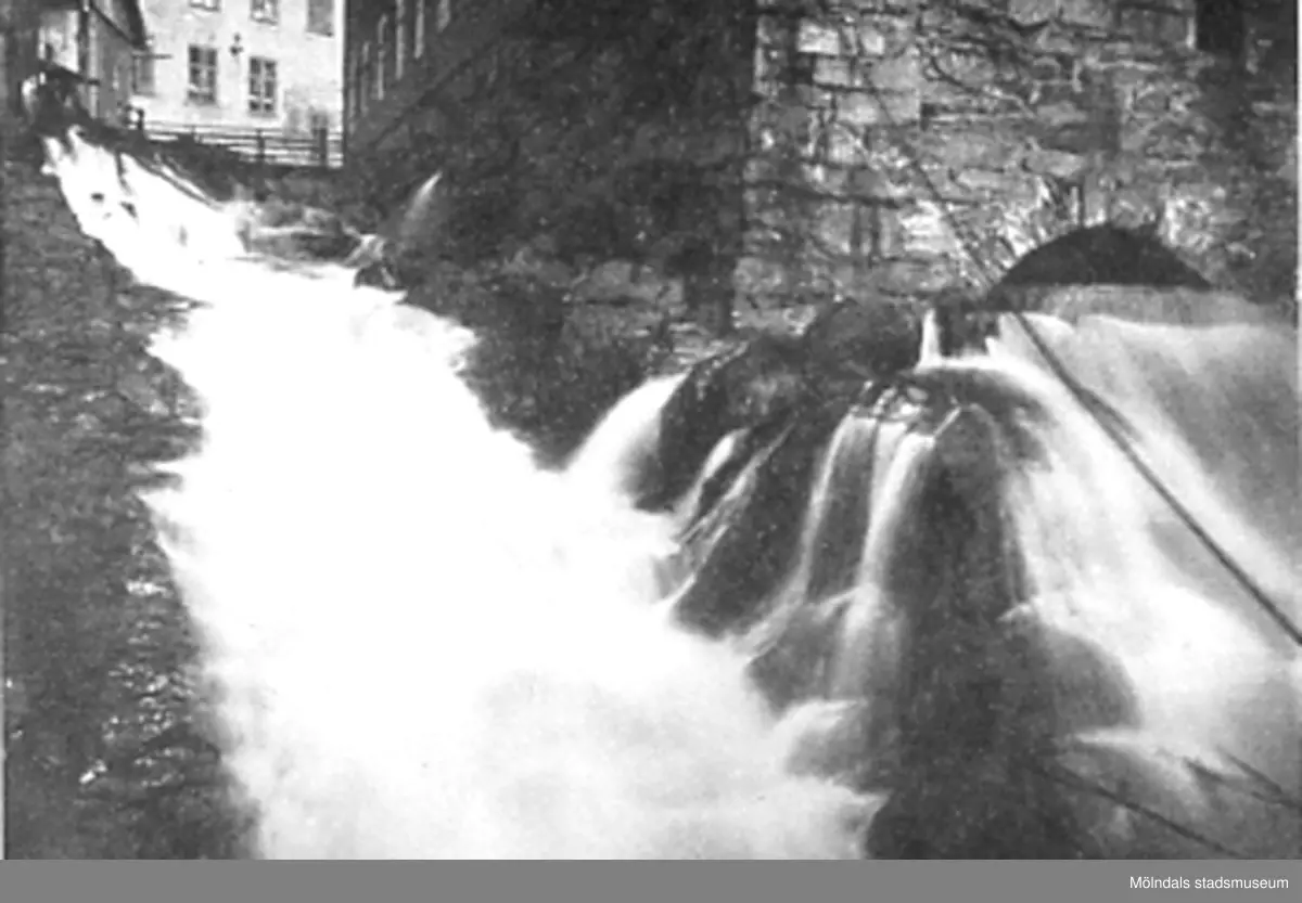 Mölndalsfallen ovanför Roys kvarn, i höjd med Kvarnfallet 20/Lilla Götafors (ej i bild), omkring 1880. Den ljusa byggnaden överst är "Strumpan". Till höger ses Kvarnfallet 18/Carlsberg Spinneri.