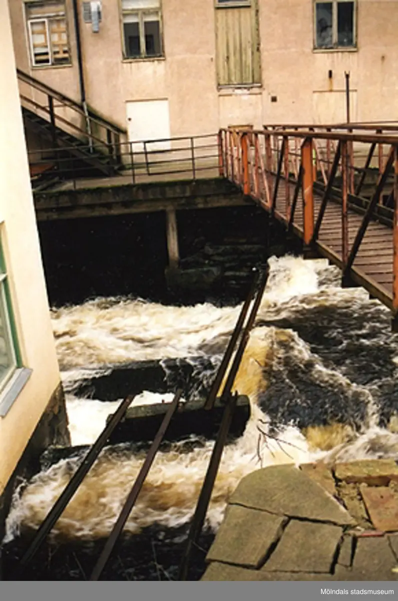 Mölndalsfallen/Forsen i Mölndals Kvarnby, år 2000. Byggnaden som skymtar till vänster är Ahlafors/Carlsbergs. Rakt fram över forsen ses "Strumpan" (Viktor Samuelsons fabrik). Gångbron flyttades senare söderut för att underlätta besök till Mölndals museum och Forscaféet.