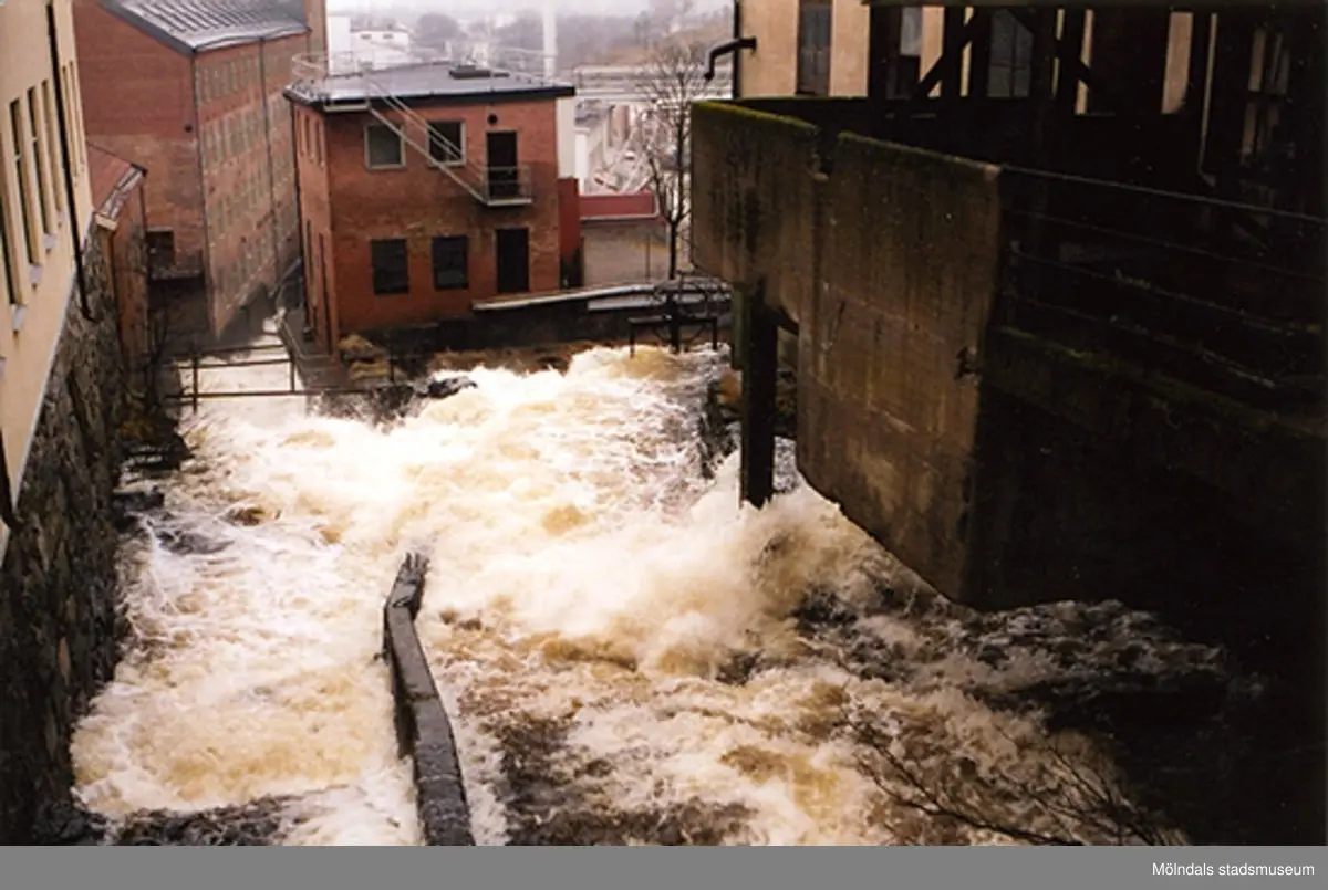 Mölndalsfallen/Forsen i Mölndals Kvarnby år 2000. Till vänster skymtar Ahlafors/Carlsbergs. Byggnaden rakt fram i mitten är fd. F-fabriken (en av Soabs byggnader). Till höger ses "Strumpans" husgrund.