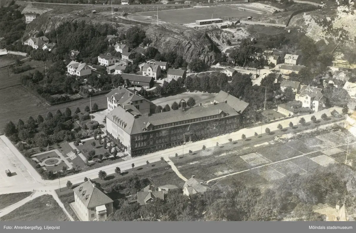Flygfoto över Kvarnbyskolan (med Trädgårdsskolan bakom), Allén, Störtfjällsgatan (då Trädgårdsgatan), troligtvis 1942. Byggnaden längst ner till vänster är gamla apoteket på Kvarnbygatan 9 (riven sedan länge). Längst ner till höger skymtar Villa Papyrus (senare: Villa Korndal) ena torn. Längst upp till höger ses Kvarnbyvallen.