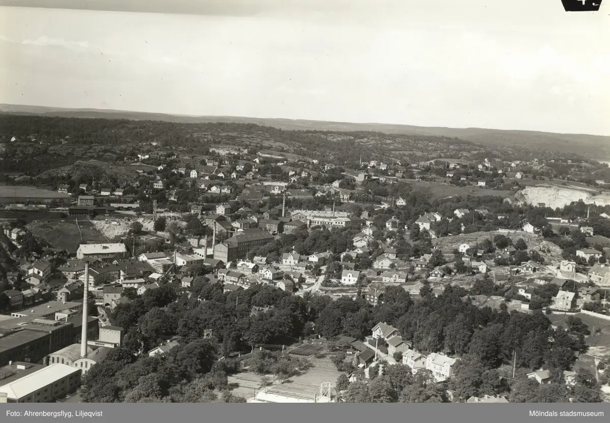 Flygfoto över Mölndal 28 april 1942. I förgrunden ses Papyrus och Forsåkersgatan. I bakgrunden Mölndas kvarnby och Stensjön.