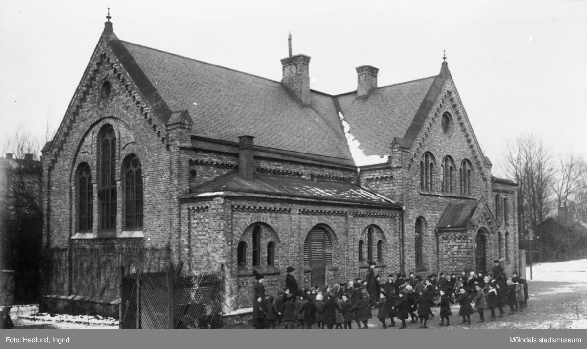 Förskola Folke Bernadottes gata 4, Göteborg. Årtal okänt. Lärare och barn står samlade utanför. Förskolan ligger i ett lugnt område av Vasastaden vid gränsen till Annedal. Den är Göteborgs äldsta förskola och i dessa charmiga och anrika lokaler har det vistats barn sedan 1880.