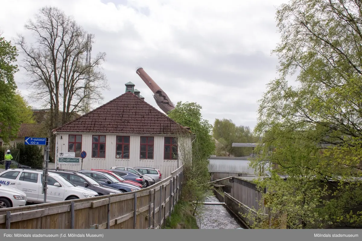 Byggnadsdokumentation av Papyrusskorstenens rivning 2015-05-08, där den lutar ca 70 grader. Vy från Forsebron över Mölndalsfallen som rinner genom hela industriområdet. Byggnaden till vänster var Papyrus gymnastiksal (Byggnad 217) på Norra Forsåkersgatan 2 B.