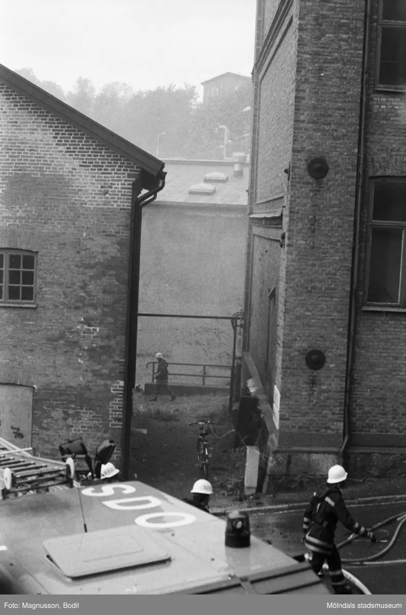 Soab-branden i Stora Götafors den 4 juni 1986. Brandmän och brandbil står på Götaforsliden utanför Nymans kvarn till vänster och Stora Götafors till höger.