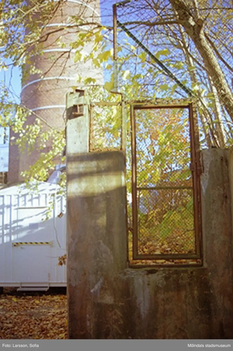 Papyrus/Stora Enso. I förgrunden till höger ses en grind med staket som sitter i betong. I bakgrunden ses skorstenen (intill byggnad 13).