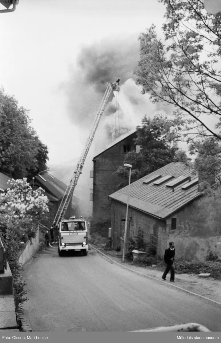 Soab-branden i Stora Götafors den 4 juni 1986. Branden bekämpas av en brandbil som står på Götaforsliden.