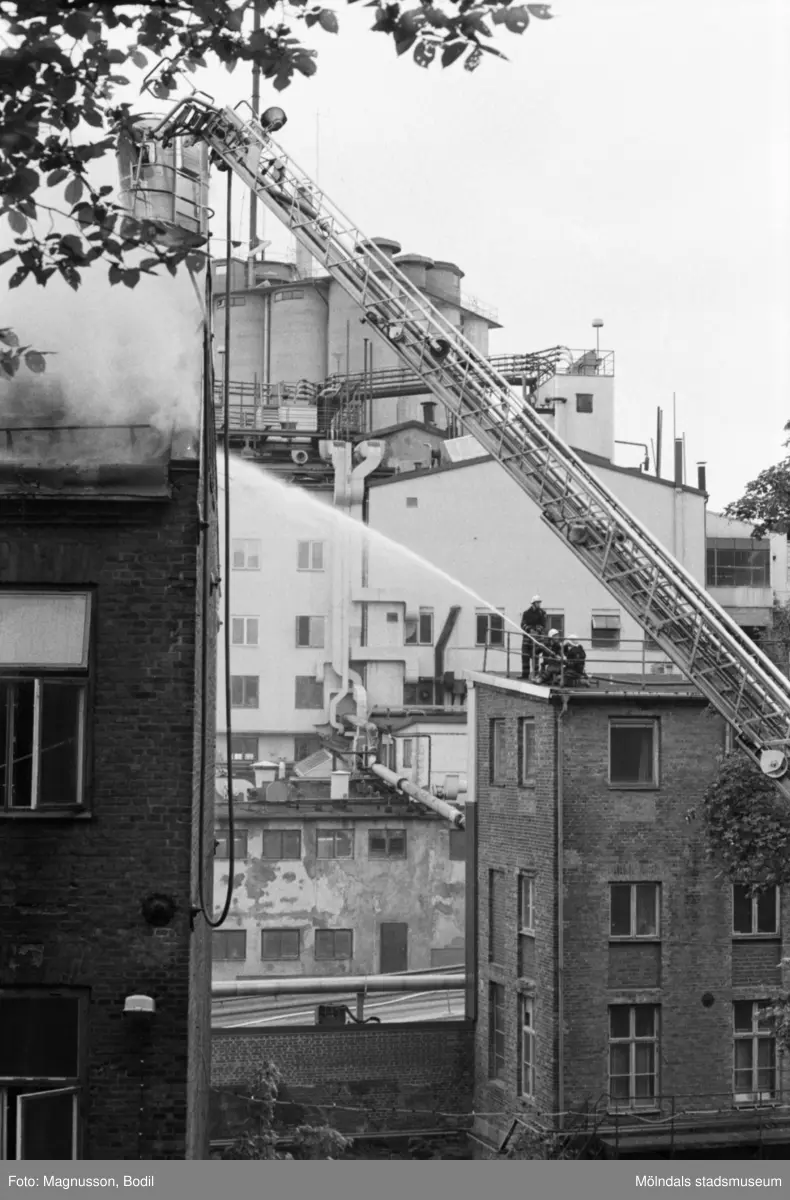 Soab-branden i Stora Götafors den 4 juni 1986. Brandmän bekämpar branden från Lilla Götafors samt med lyftkran.