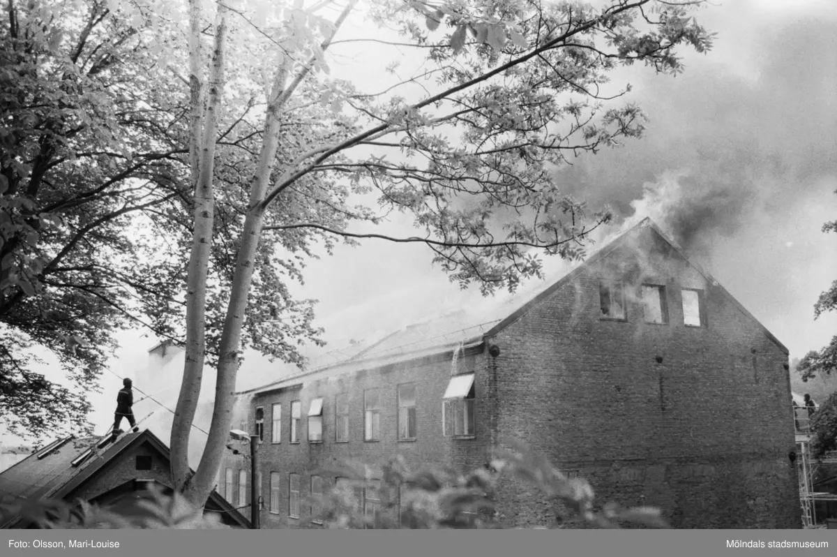 Soab-branden i Stora Götafors den 4 juni 1986. Branden bekämpas från fastigheten mitt emot.