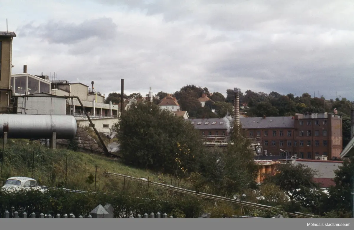Vy från Samuel Norbergsgatan mot SOAB:s fabriksbyggnader vid "Kråkan", Kvarnbygatan, i Mölndals Kvarnby på 1970-talet. I bakgrunden till höger ses även Eisers fabriksbyggnad, nuvarande Stora Götafors.