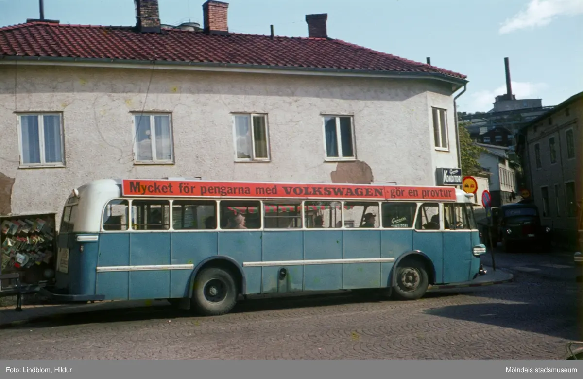 En blå buss framför huset Kvarnbygatan 45 vid Gamla Torget i Mölndal, 1960-tal. Till höger ses även del av Kvarnbygatan 6, byggnad tillhörande SOAB.