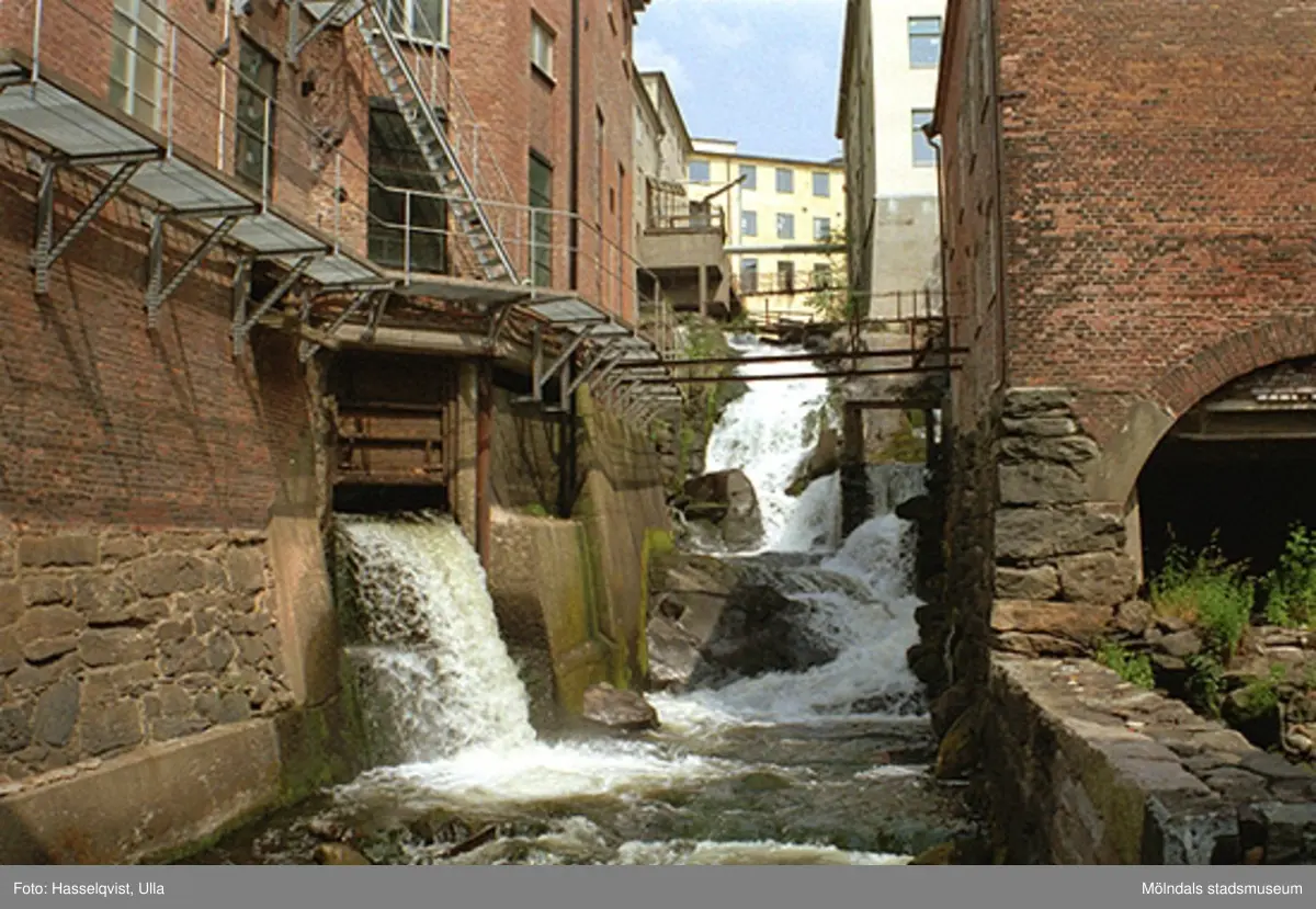 Kulturmiljön vid forsen i Mölndals kvarnby, 1997-07-08. Till vänster ses F-fabriken (Oljeslageriet). Längst upp i mitten ses "Strumpan". Närmast till höger Lilla Götafors och ovanför Carlsbergs Spinneri/Ahlafors.